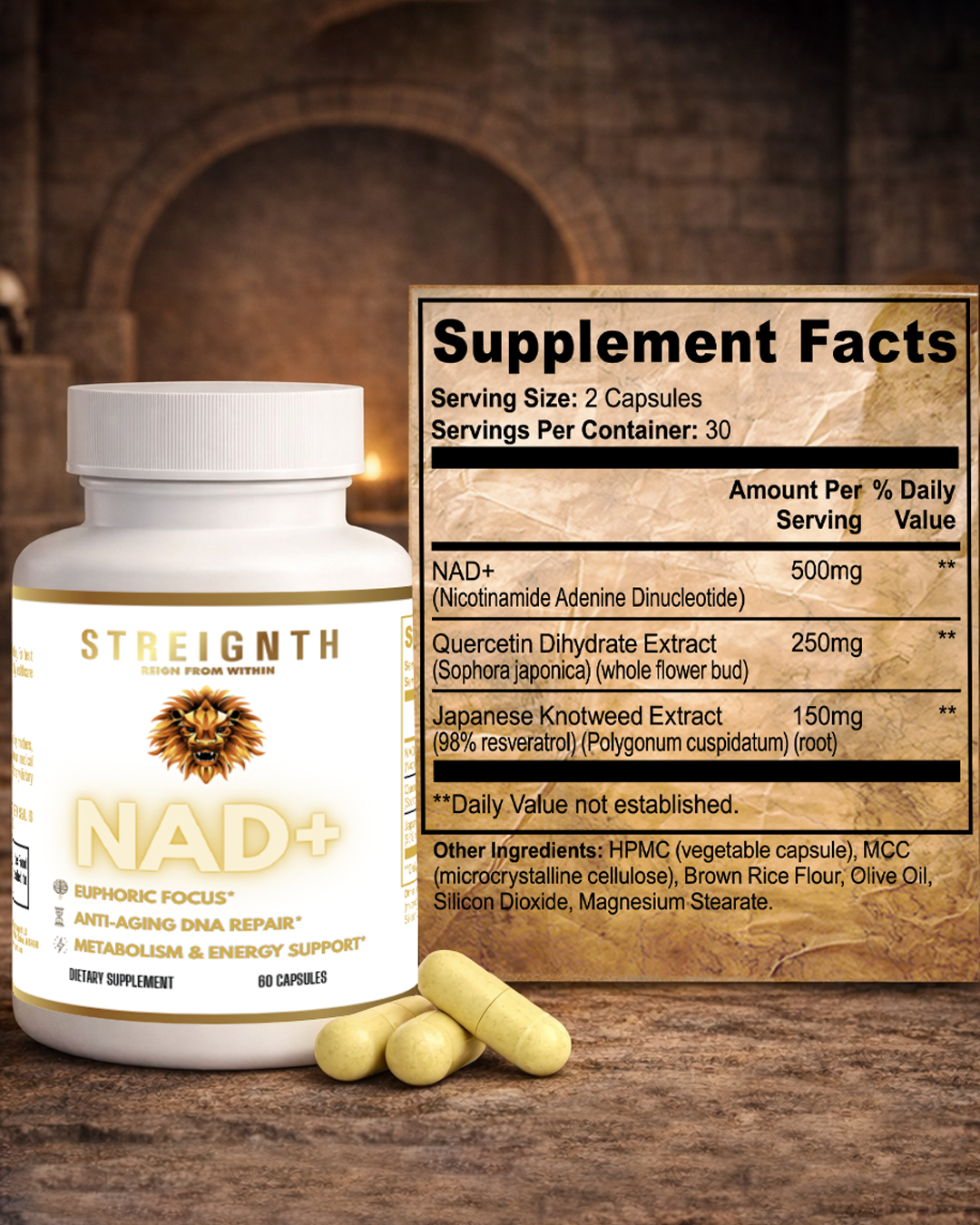Vegetable capsule (HPMC), MCC, Brown Rice Flour, Olive Oil, Silicon Dioxide, Magnesium Stearate